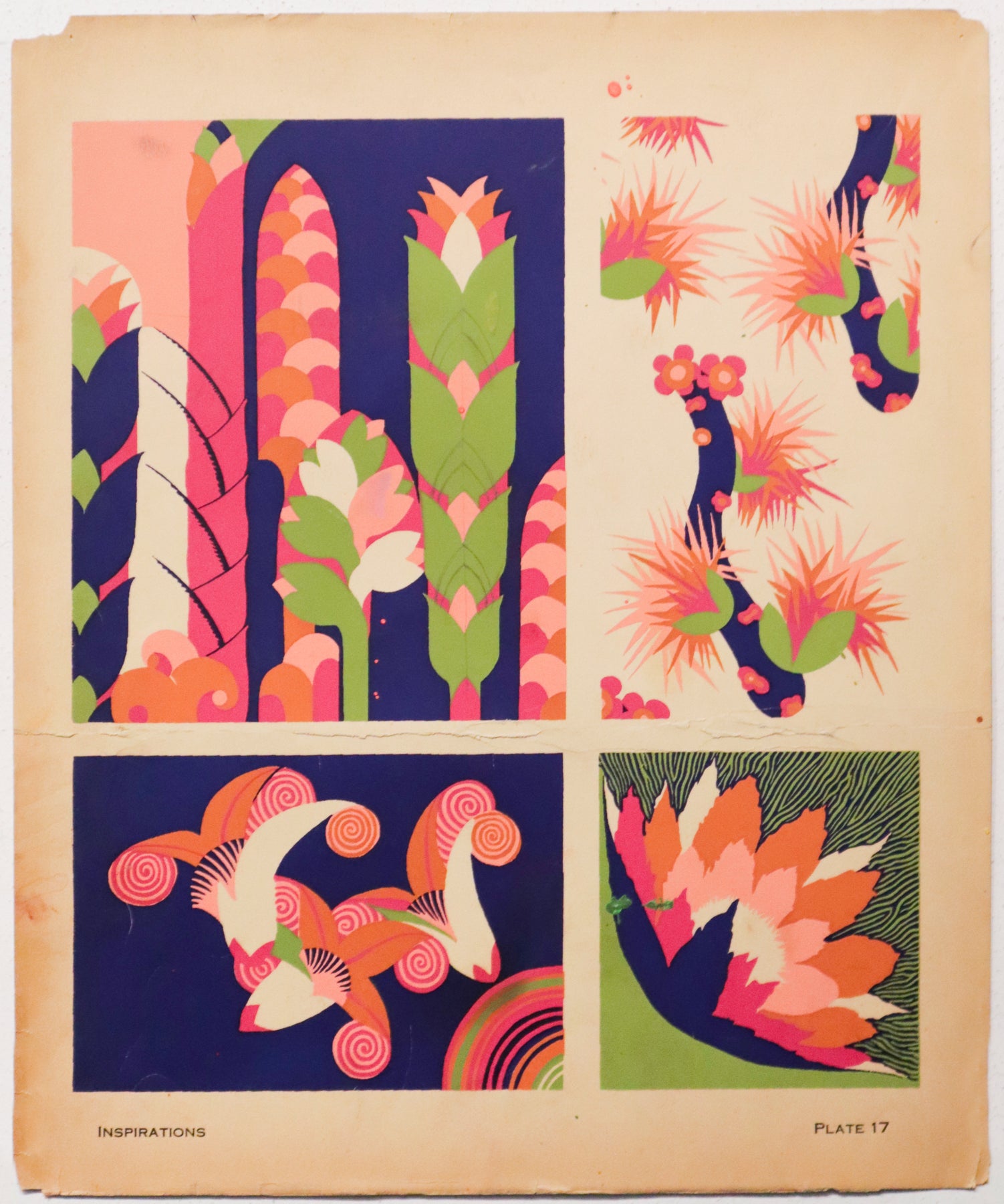 This pochoir (a French variation of a hand-coloured stencil) would have been used by designers to show clients and collectors patterns for wall-paper, fabric or tapestries. Its excellent colour and fabulous detail make it a unique vintage piece, perfect for any design lover.