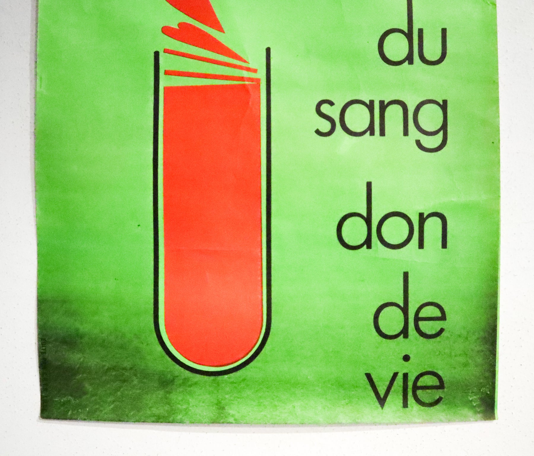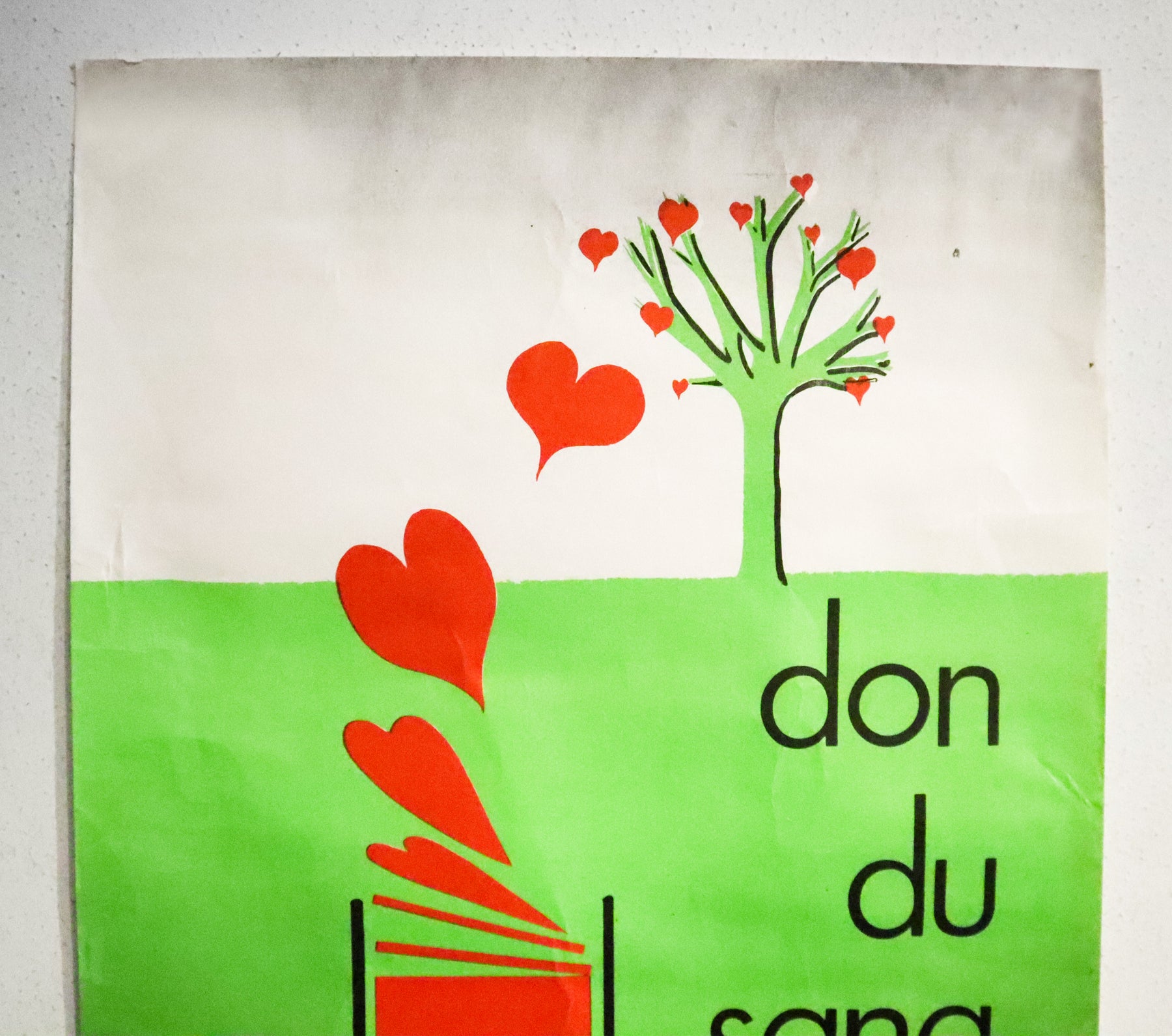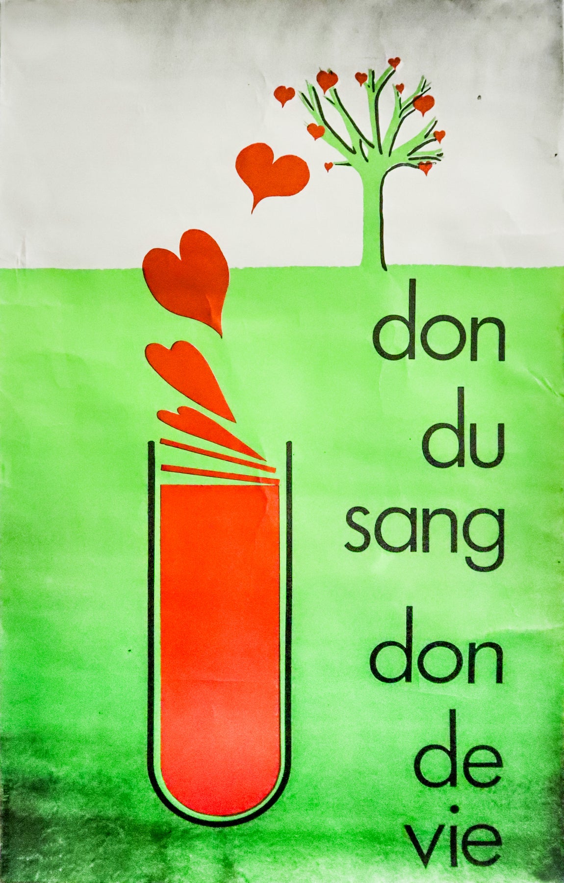 About the poster: A vibrant French public health poster promoting blood donation, featuring a minimalist design where red hearts rise from a test tube to form a flourishing tree of life. The phrase “Don du sang, don de vie” (“Give blood, give life”) underscores the life-giving power of generosity. With its fresh green background and bold graphic simplicity, this poster reflects the optimistic, modern design sensibility of 1970s France.