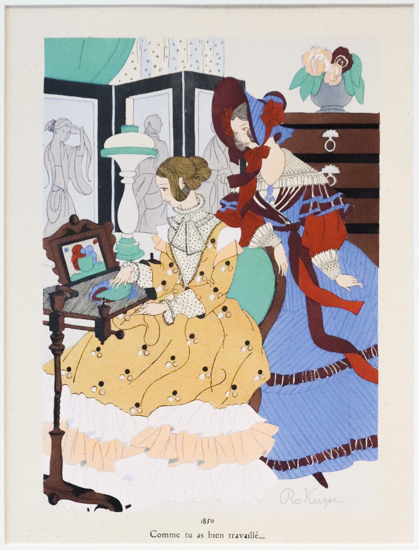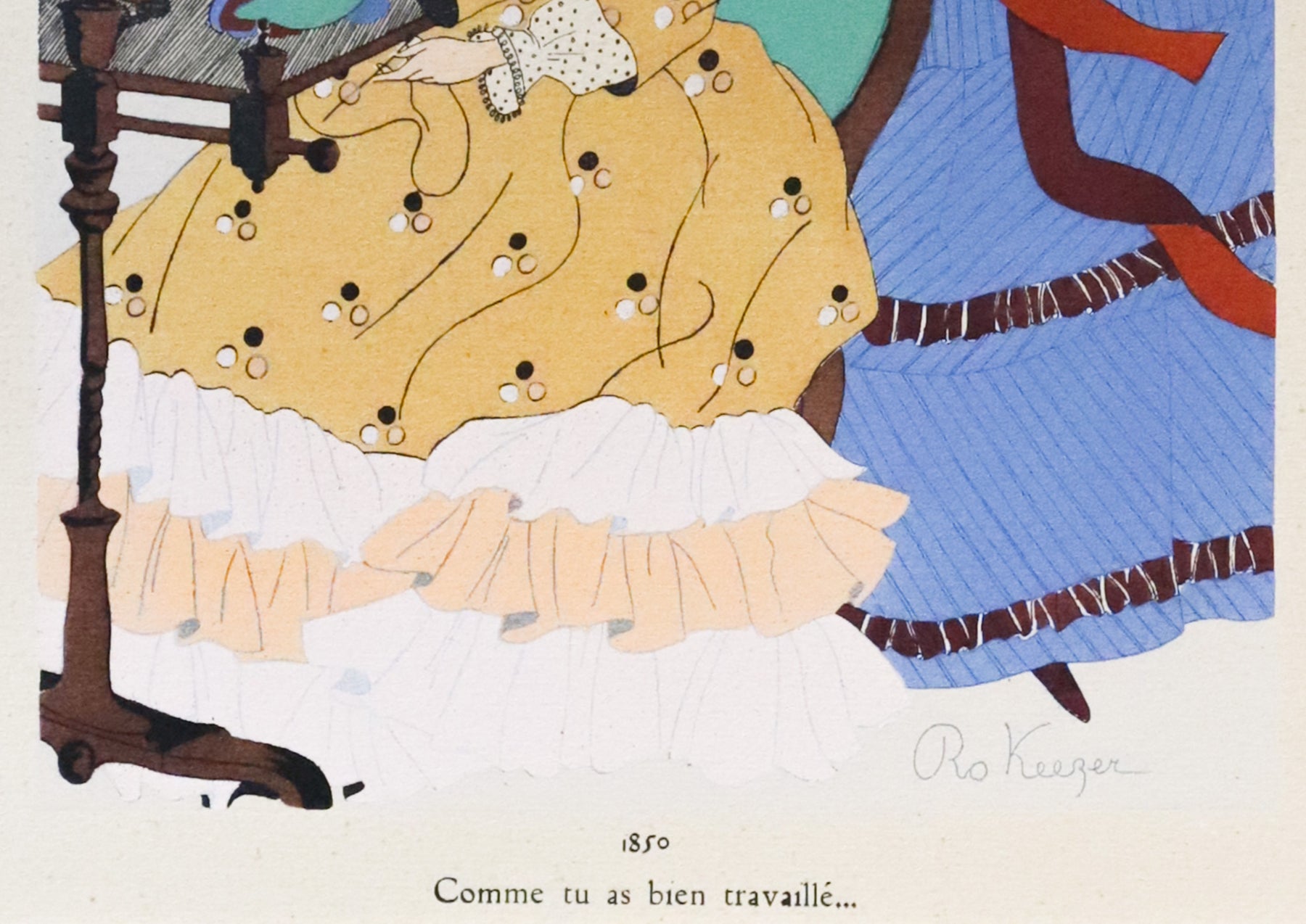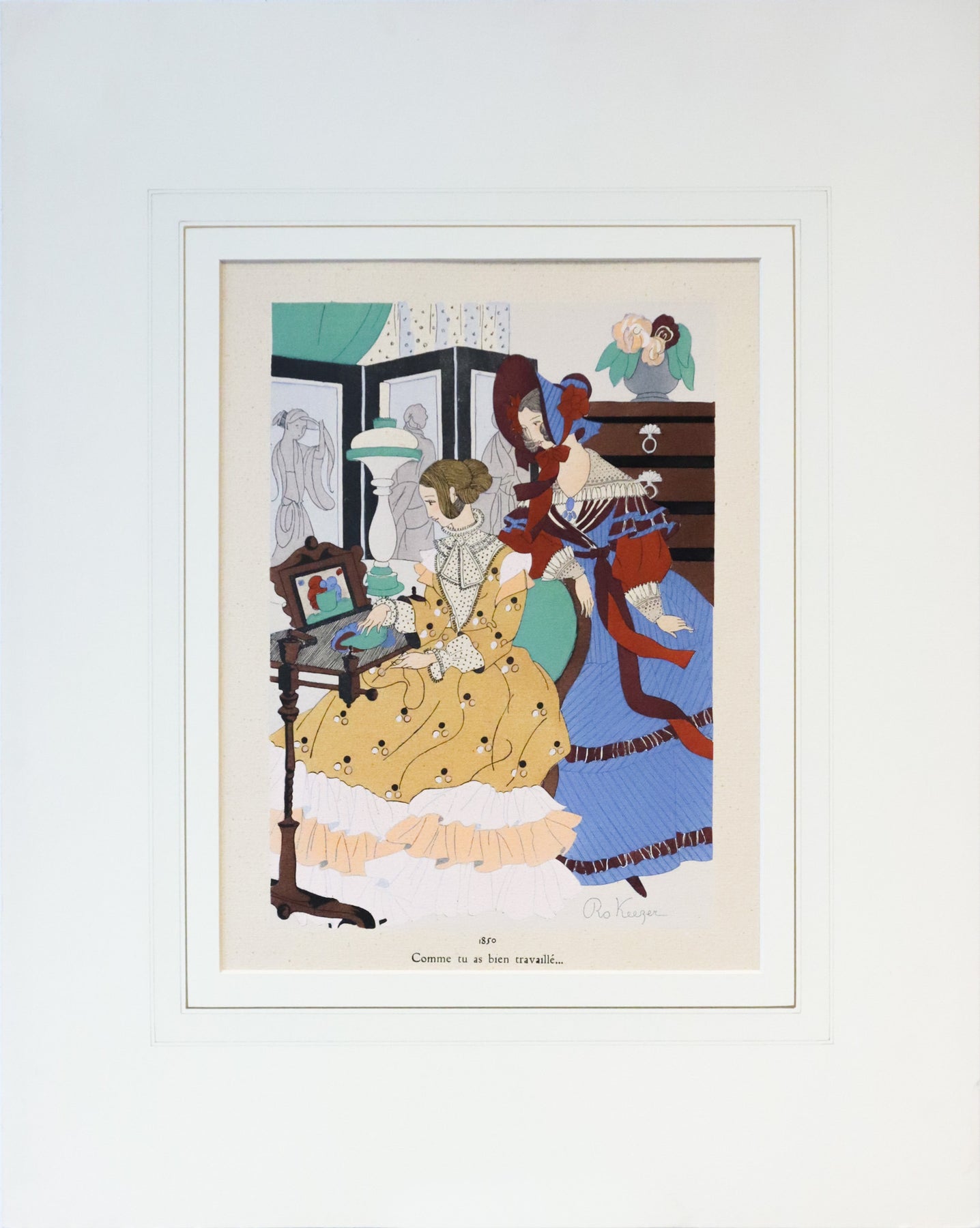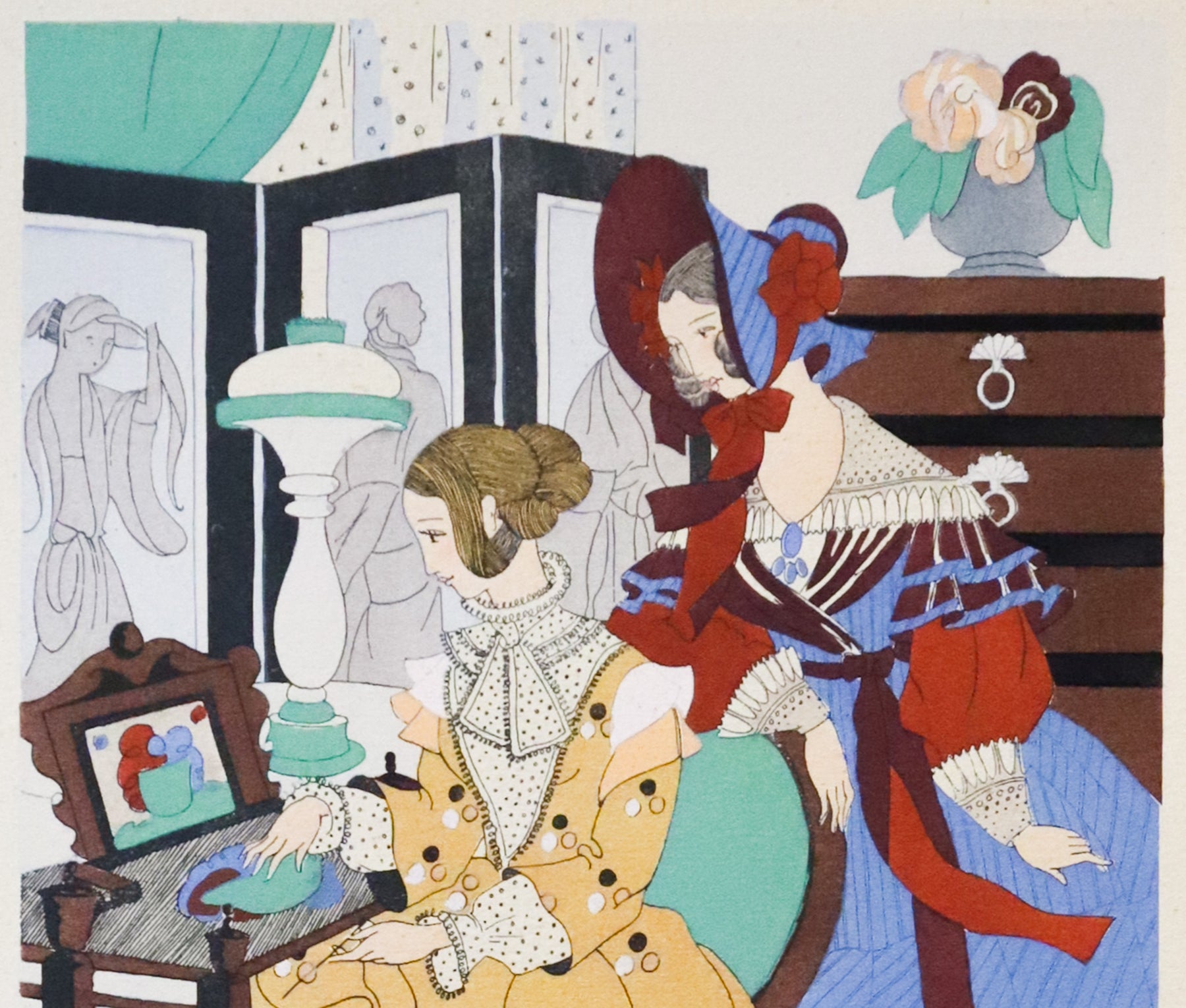 About The Poster: From a lovely set of prints from the album "La Toilette Féminine et les Bibelots de l'Époque Romantique" (Feminine Toiletries and Trinkets of the Romantic Era). Printed in 1930 by the Nilsson Editions, these pochoirs (hand painted stencils) were designed to celebrate the centenary of Romanticism and more specifically elegance and feminine fashion between 1830 and 1850. (Source: drouot.com)