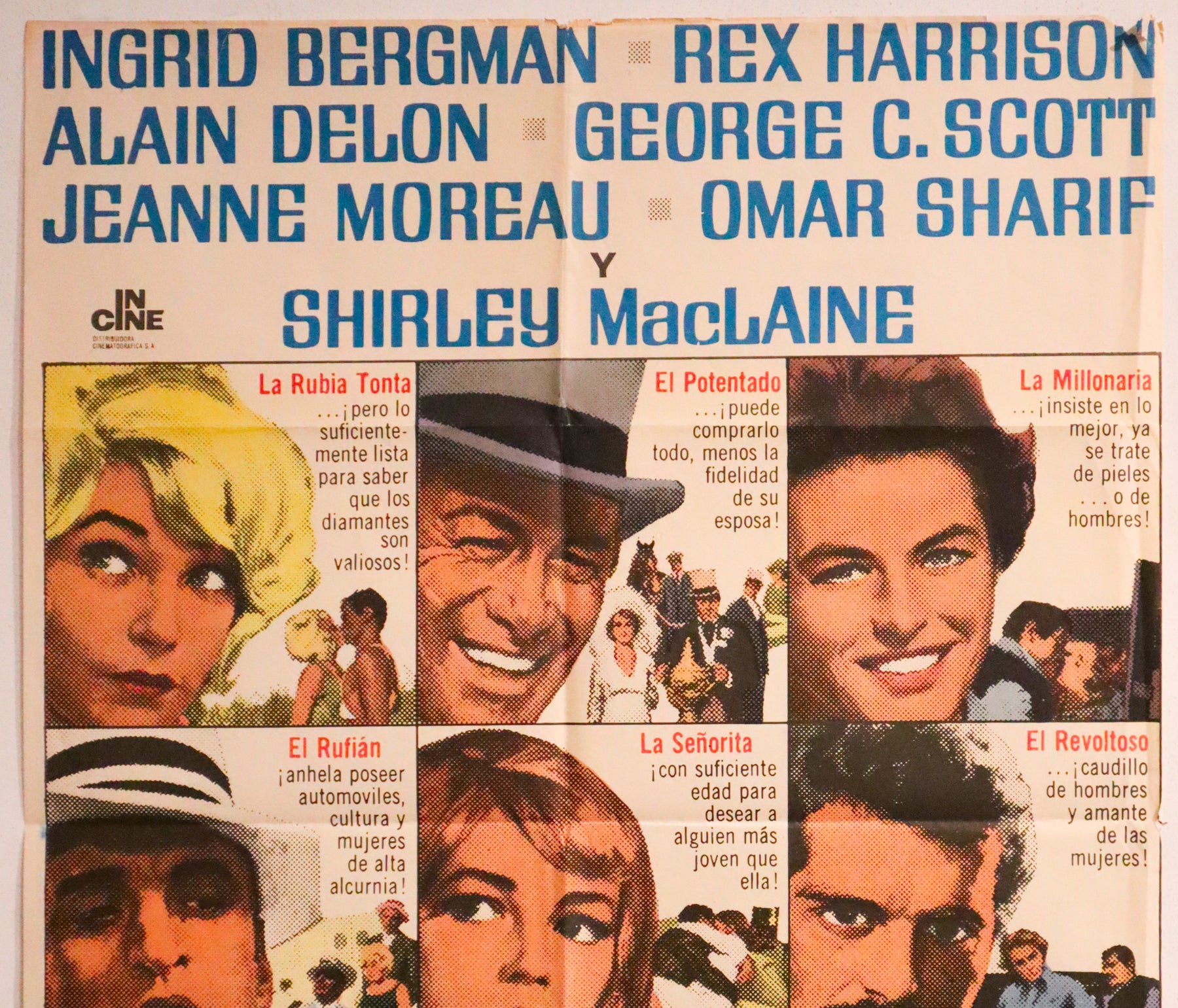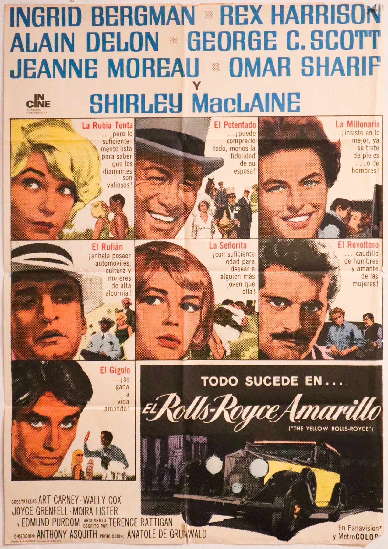 About the poster: "Three stories about the lives and loves of those who own a certain yellow Rolls-Royce: **First purchased by Lord Charles Frinton, the Marquess of Frinton (Sir Rex Harrison) for his wife as a belated anniversary present. Lady Eloise Frinton, the Marchioness of Frinton (Jeanne Moreau) finds her own use for the vehicle, one which prompts her husband to sell the car in disgust. **Gangster Paolo Maltese's (George C. Scott's) moll Mae Jenkins (Shirley MacLaine) thinks the Rolls is a "classy" car in which to tour Paolo's hometown in Italy. When Paolo is called away to the U.S. to finish some "business", a bored Mae takes the Rolls-Royce on a spin through the country, enjoying both the sights and handsome Italian photographer Stefano (Alain Delon), who crosses her path. **By the outbreak of World War II, the car has come into the possession of socialite Gerda Millett (Ingrid Bergman). While on her way to visit Yugoslavian royalty, Gerda and the Rolls-Royce eventually become most willing participants in the Yugoslavian fight." (IMDb)