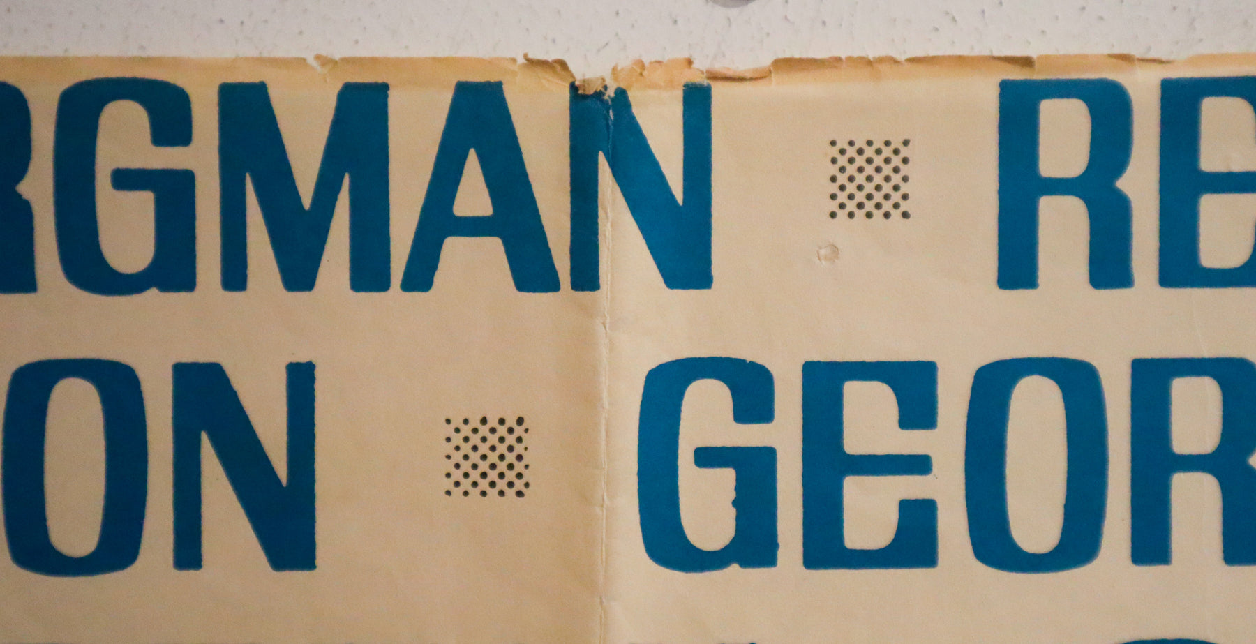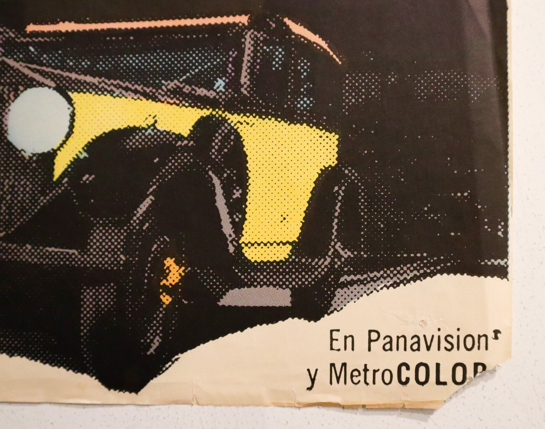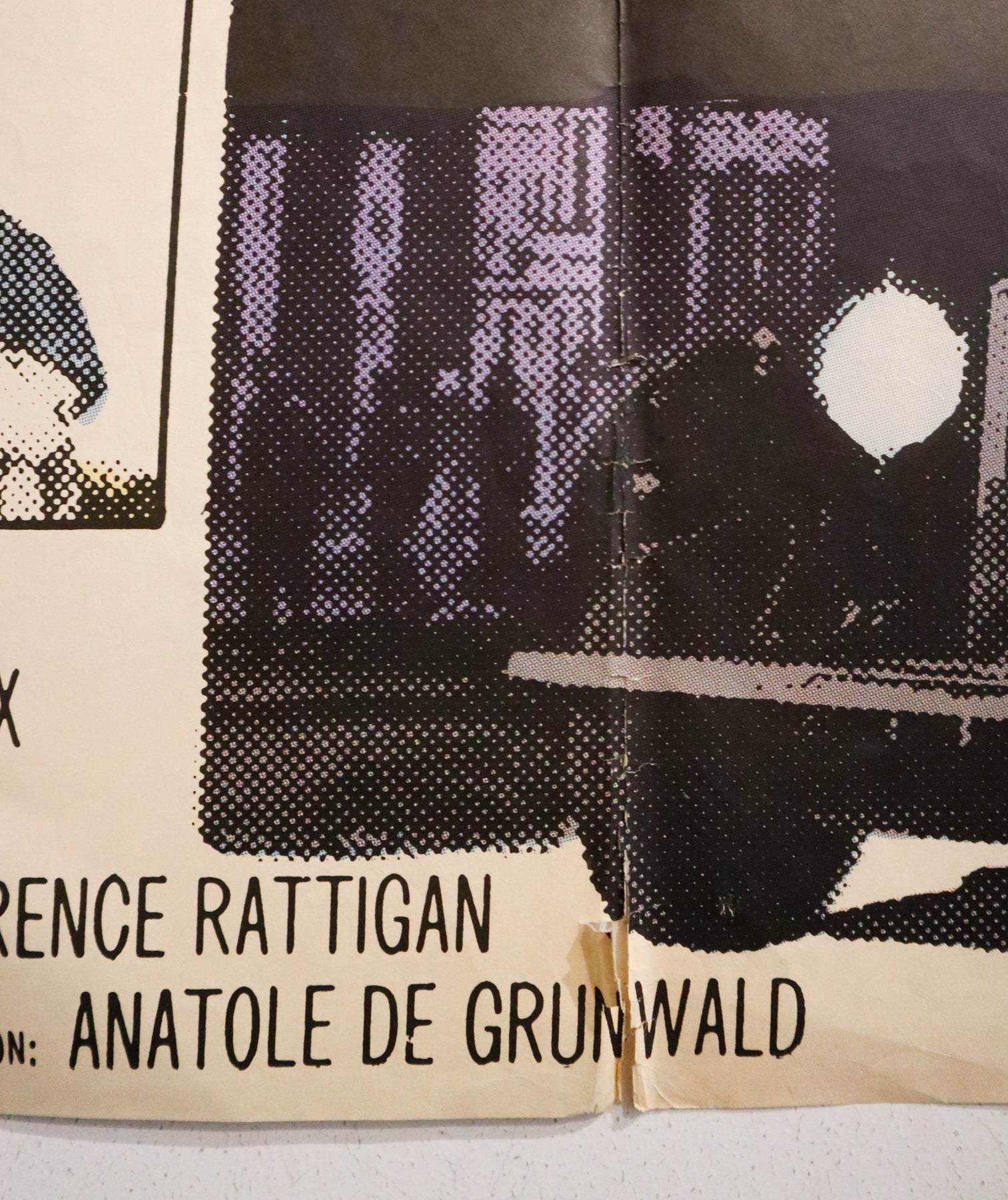This poster has obvious fold lines, many tears on the bottom and top, a hole in the middle and a missing corner. Please see pictures.