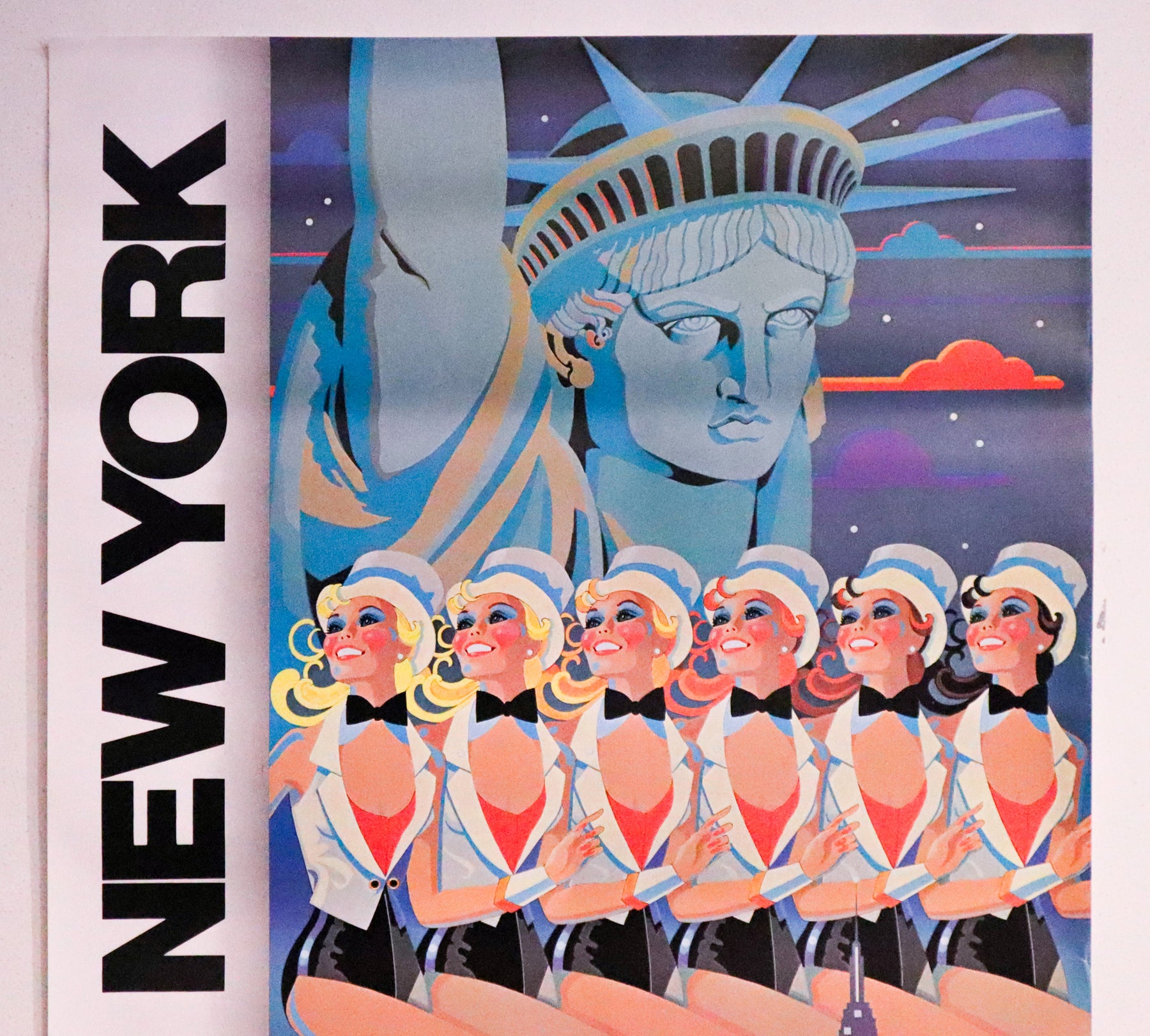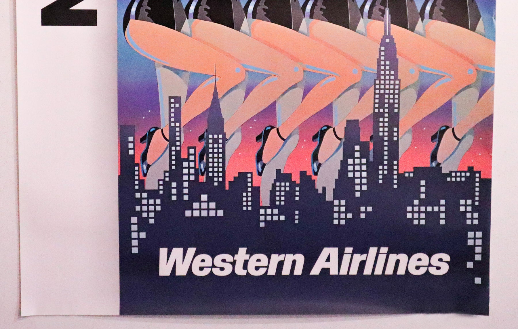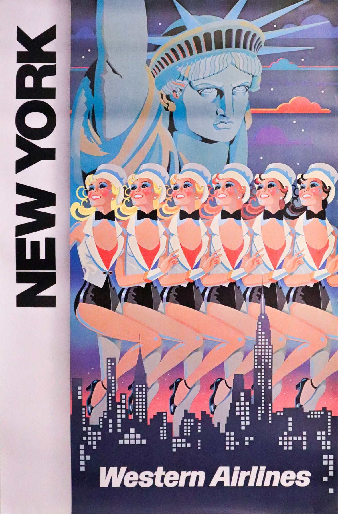 À propos de l’affiche : Affiche vintage de la compagnie Western Airlines promouvant New York, mettant en avant la skyline, la Statue de la Liberté et les célèbres Rockettes. Initialement créée comme publicité aérienne, elle présente une ligne de chœurs dynamique des fameuses Rockettes devant le décor emblématique de Lady Liberty. Pièce marquante de l’histoire de l’aviation, cette affiche constitue un excellent ajout à toute collection sur les Rockettes ou sur New York.