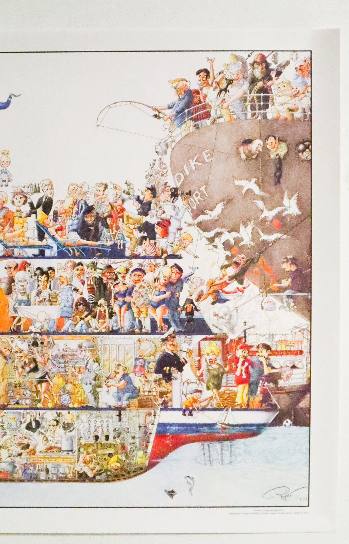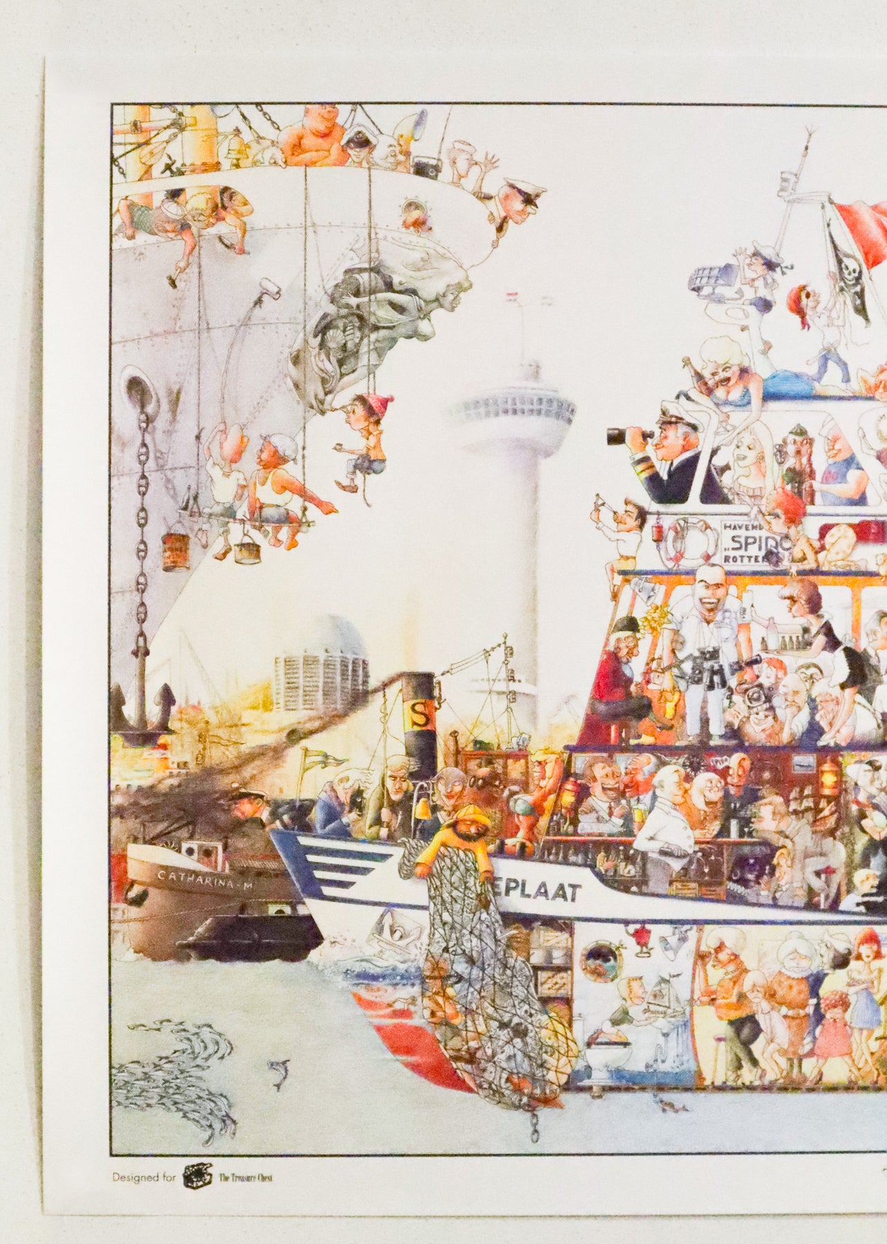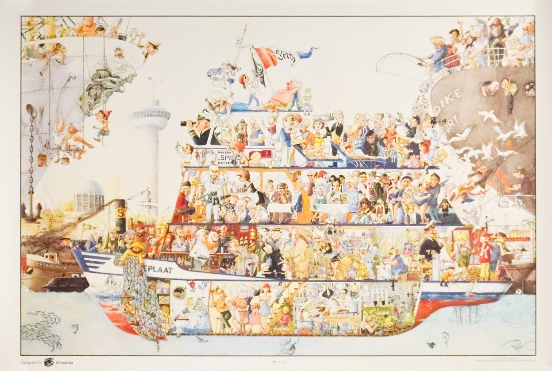 À propos de l’affiche : Dans cette affiche vivante et richement détaillée, Rogier Miekel transforme un paquebot animé en scène de l’exagération comique. Chaque pont est rempli de personnages caricaturés — officiers, touristes, artistes et membres d’équipage — engagés dans un tourbillon d’activités qui parodient la vie en mer. Des dîners élégants aux fêtes bruyantes, de la romance au désordre, cet humour chaotique offre un regard à la fois satirique et affectueux sur les voyages maritimes de l’après-guerre. Produite dans les années 1960, l’œuvre illustre le style distinctif de Miekel : des compositions denses regorgeant de vignettes narratives, d’un humour acéré et d’un regard espiègle sur les travers humains.