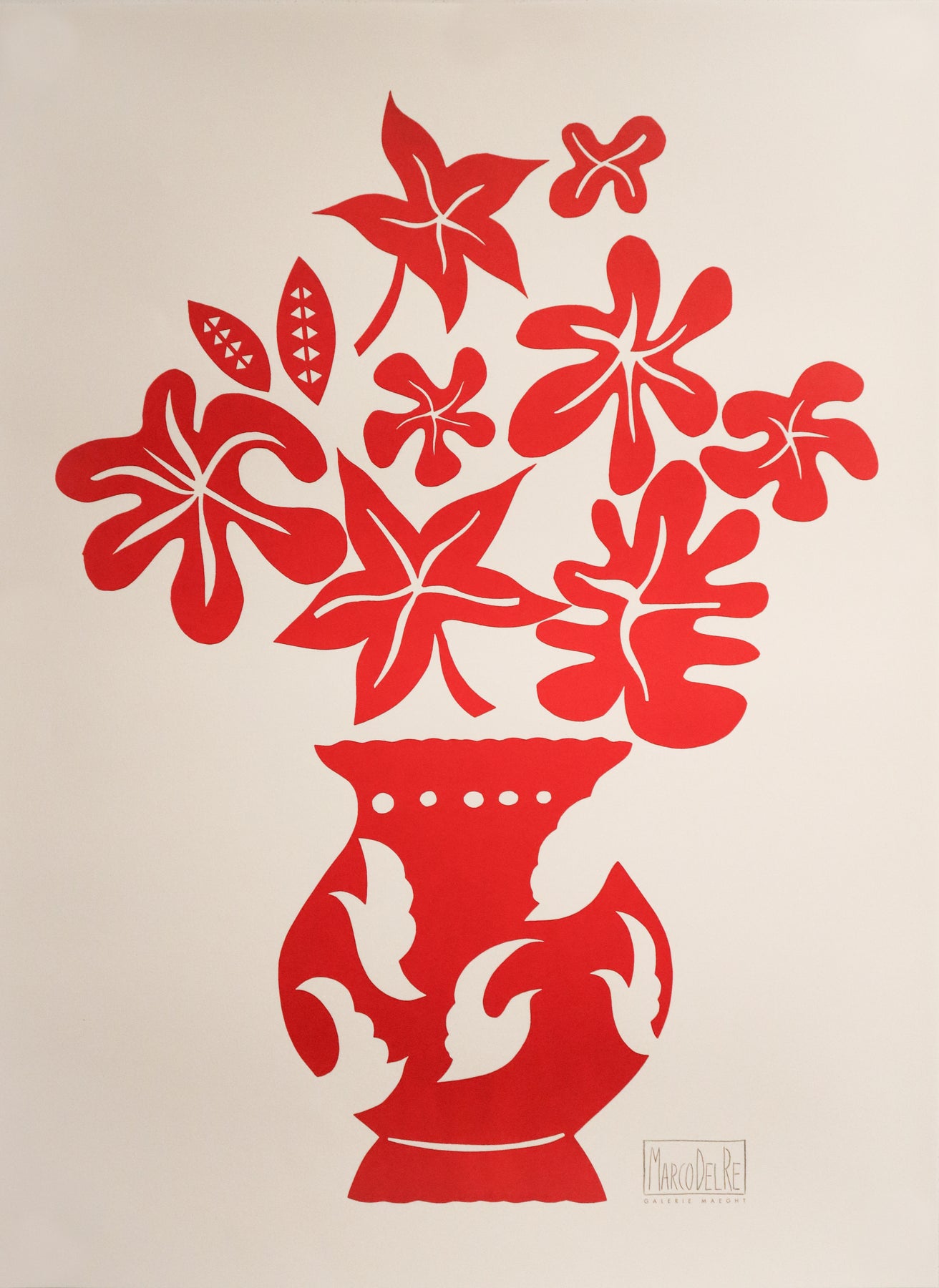 À propos de l'affiche : Issue d'une série d'études sur le vase et le bouquet, cette affiche lithographique explore les subtiles variations de forme et de couleur. L'artiste a délibérément répété des motifs de vases presque identiques, démontrant ainsi comment un simple changement de palette peut transformer l'atmosphère entière d'une composition et, par extension, l'espace dans lequel elle est placée.