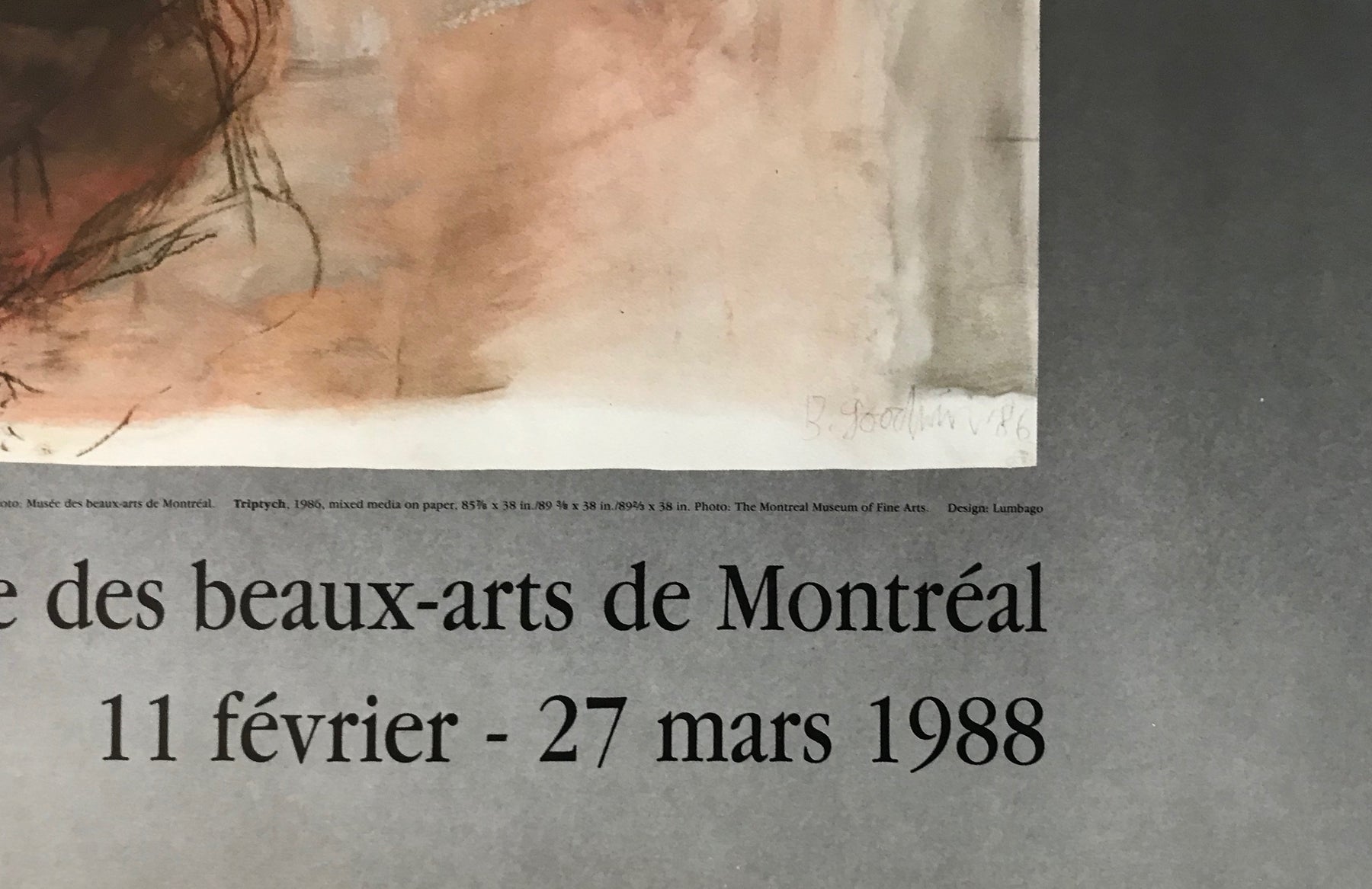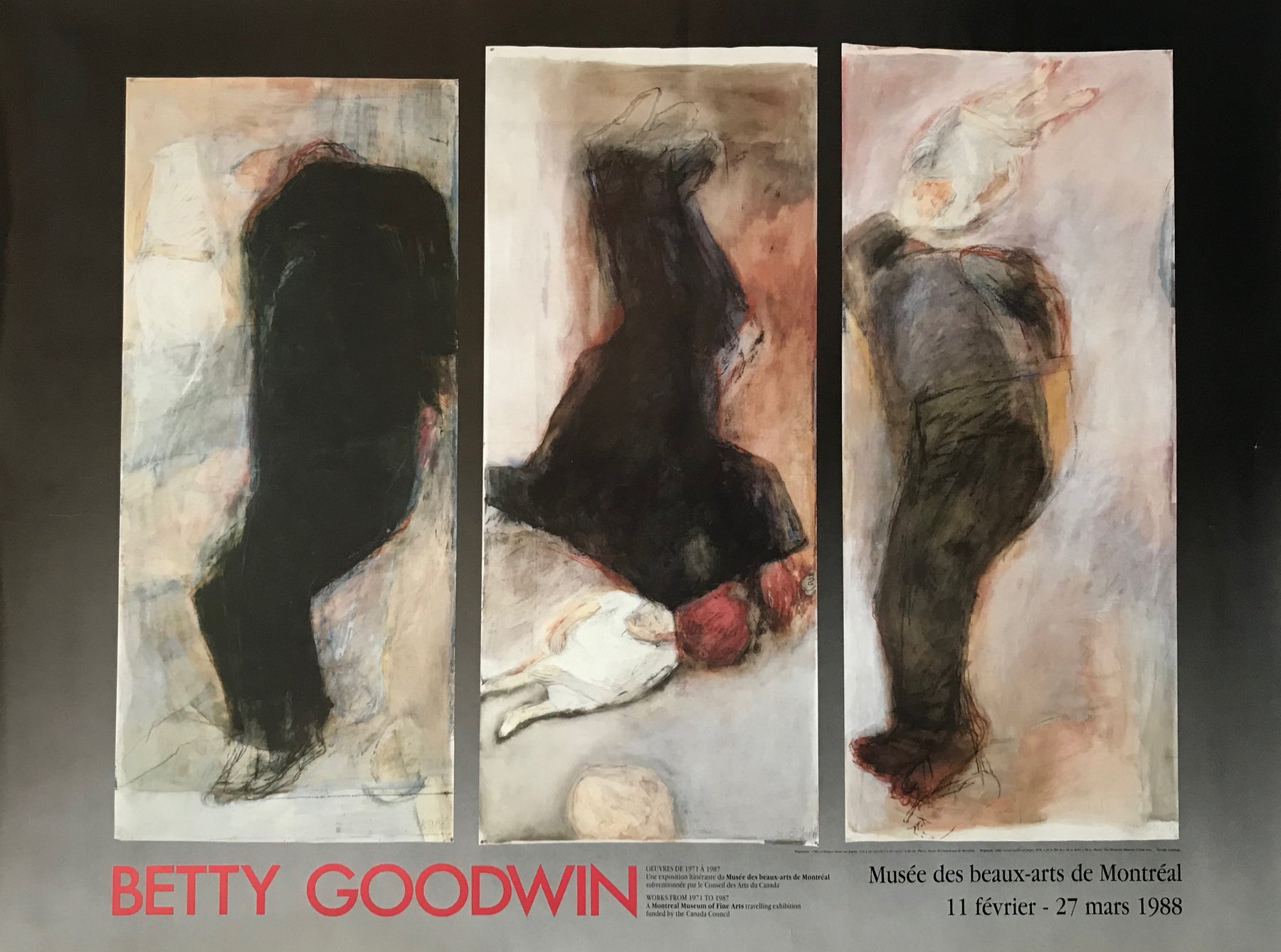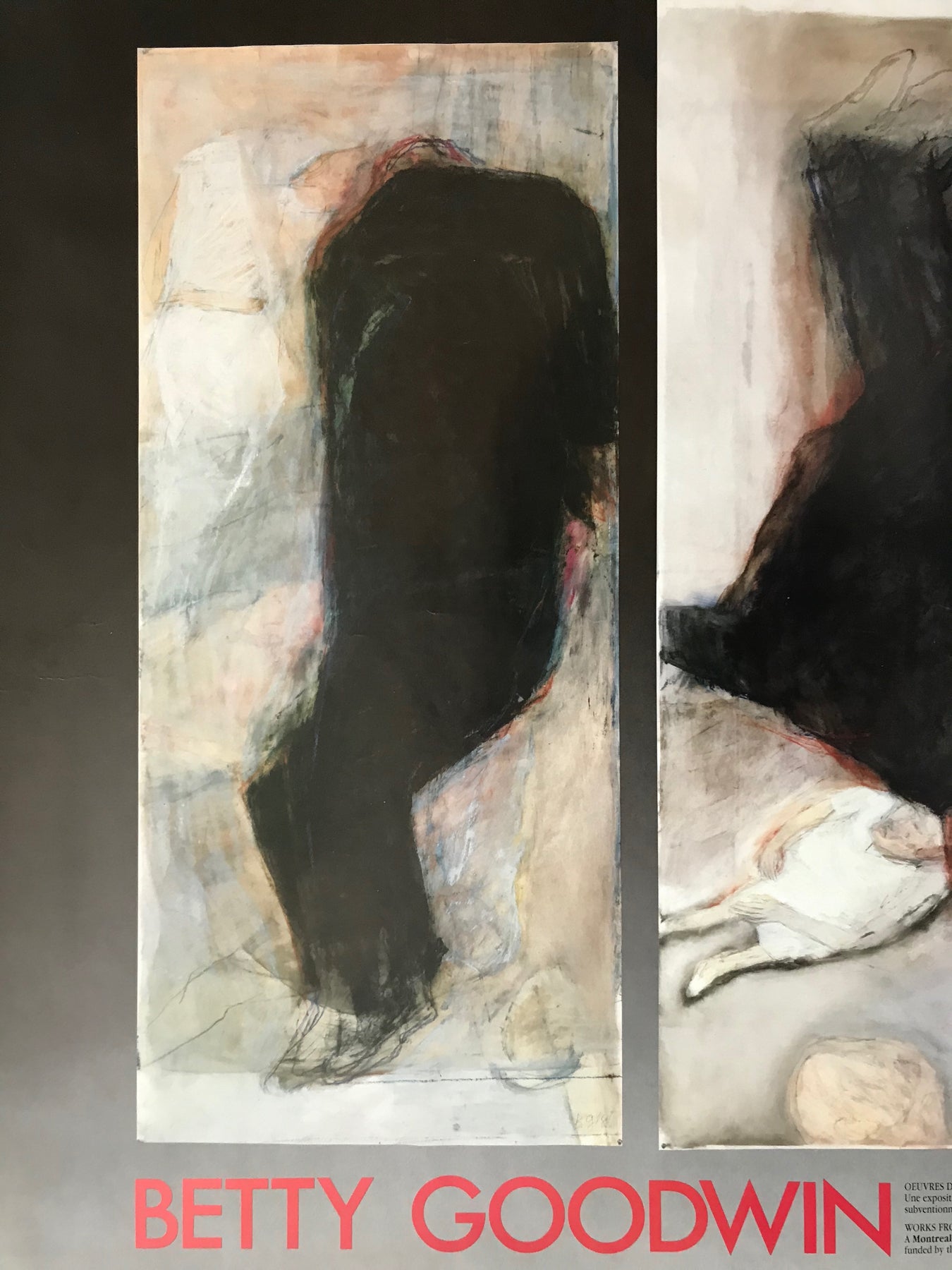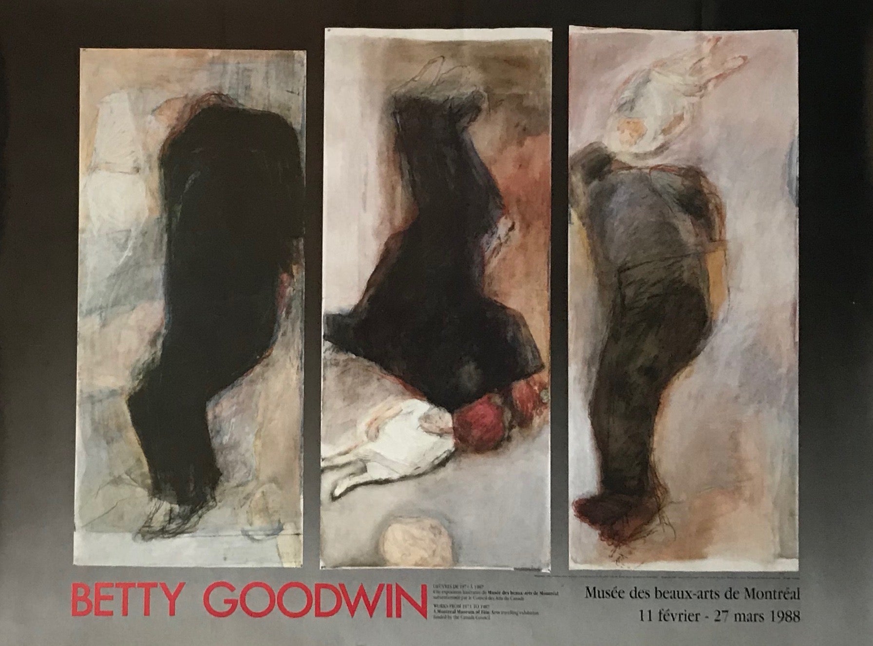 À propos de l'affiche: Une magnifique affiche pour une exposition de Betty Goodwin qui a eu lieu au Musée des beaux-arts de Montréal, sur feuille surdimensionnée. Le Musée contribue à transmettre le sentiment d'émerveillement plus grand que nature qu'éprouvaient les spectateurs lorsqu'ils regardaient ces œuvres. Superbes couleurs et verve - nous pensons que ce serait un merveilleux ajout à toute pièce qui aurait besoin d'un remontant!