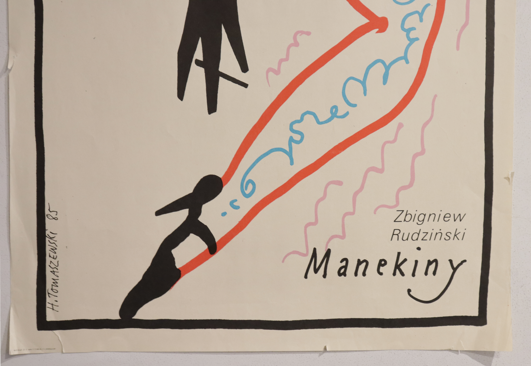 À propos de l'affiche : À partir des années 1950 et jusqu'aux années 1980, l'école polonaise d'affiches a combiné l'esthétique de la peinture avec la concision et la métaphore simple de l'affiche. Elle a développé des caractéristiques telles que le geste pictural, la qualité linéaire et les couleurs vives, ainsi qu'un sens de la personnalité individuelle, de l'humour et de la fantaisie. C'est de cette manière que l'affiche polonaise a pu rendre moins apparente la distinction entre designer et artiste.