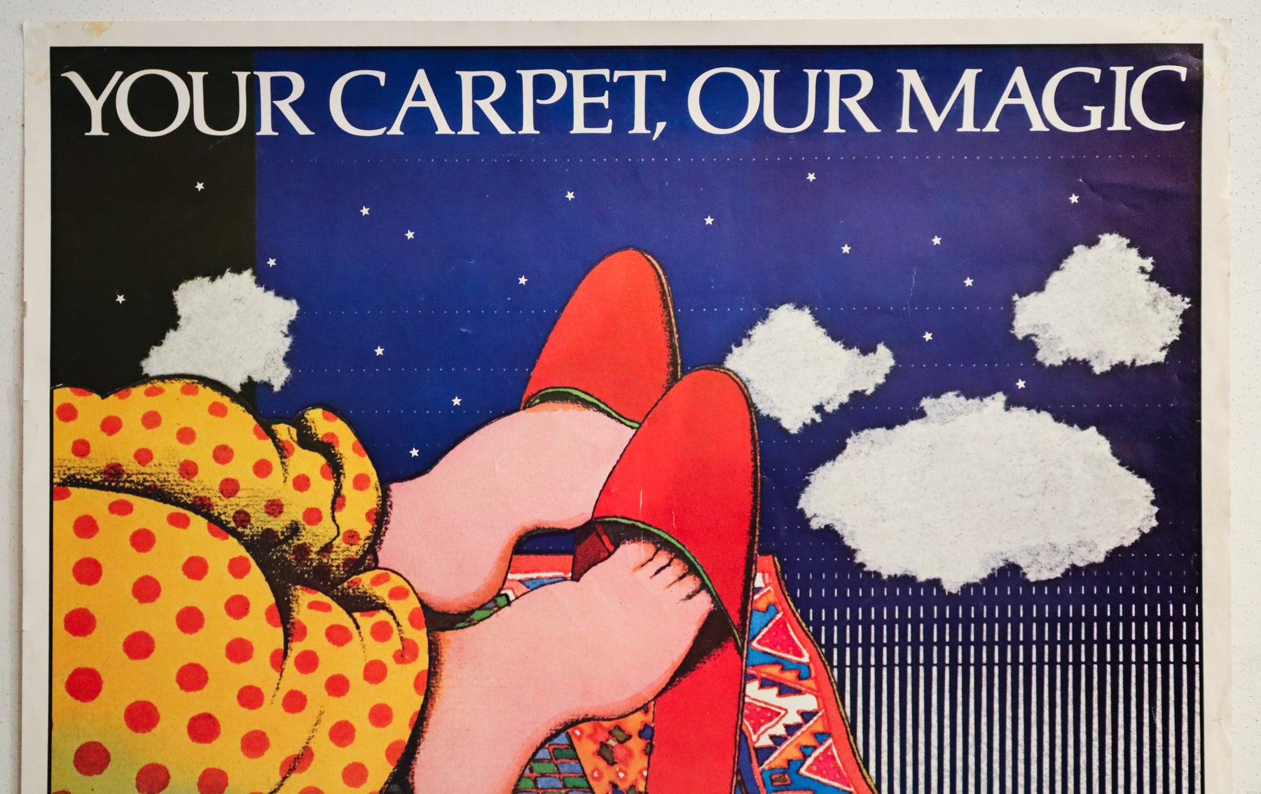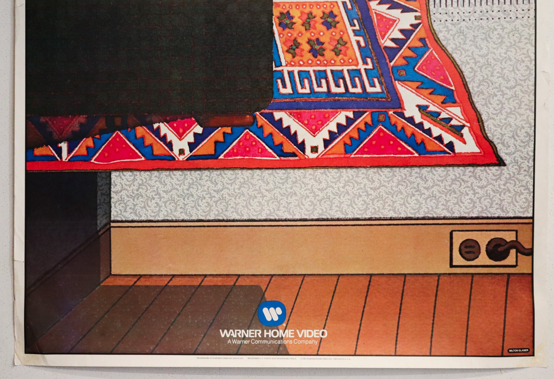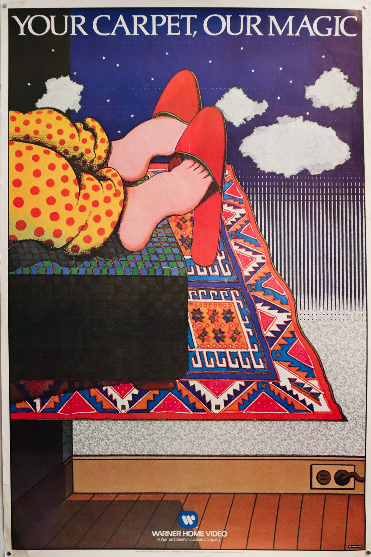 À propos de l'affiche : Affiche promotionnelle publiée par Warner Home Video, représentant un tapis volant dans un style fantaisiste, associant de manière ludique le confort de la maison à l'évasion offerte par le cinéma. Le slogan audacieux « Your Carpet, Our Magic » (Votre tapis, notre magie) reflète l'approche créative de l'époque en matière de marketing des divertissements vidéo à domicile. Une œuvre vivante et imaginative qui reflète l'optimisme culturel des premières publicités pour les cassettes VHS.