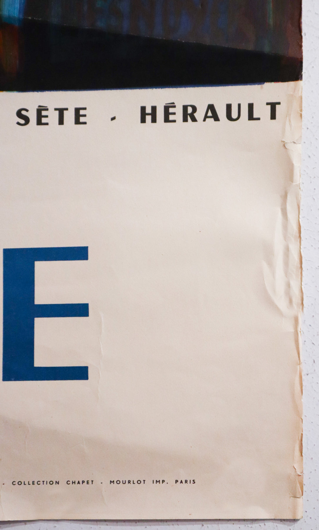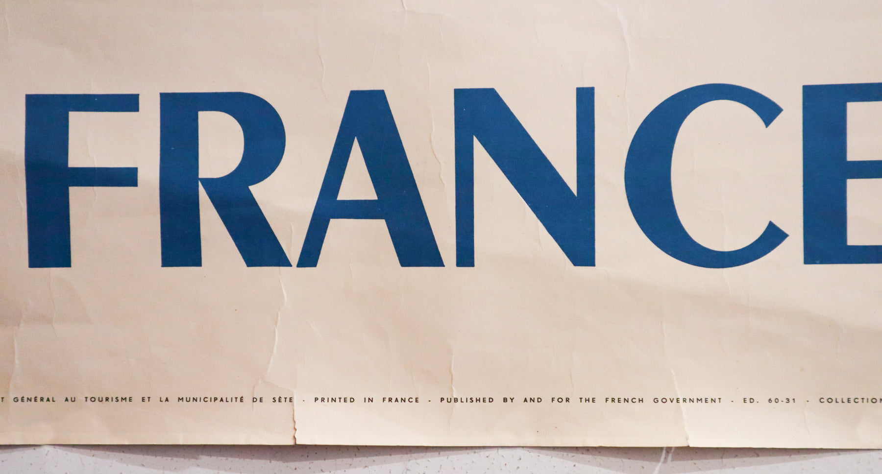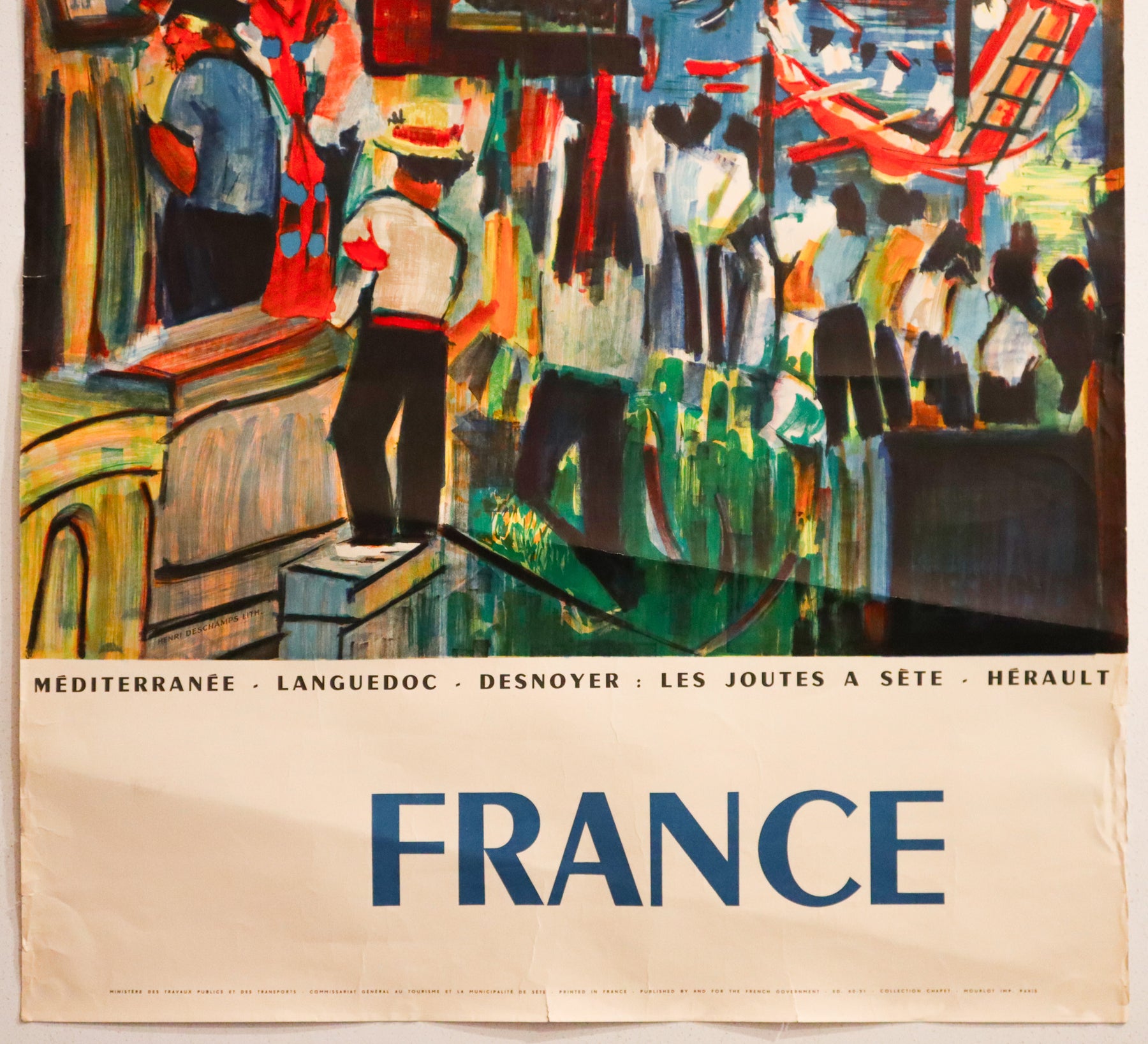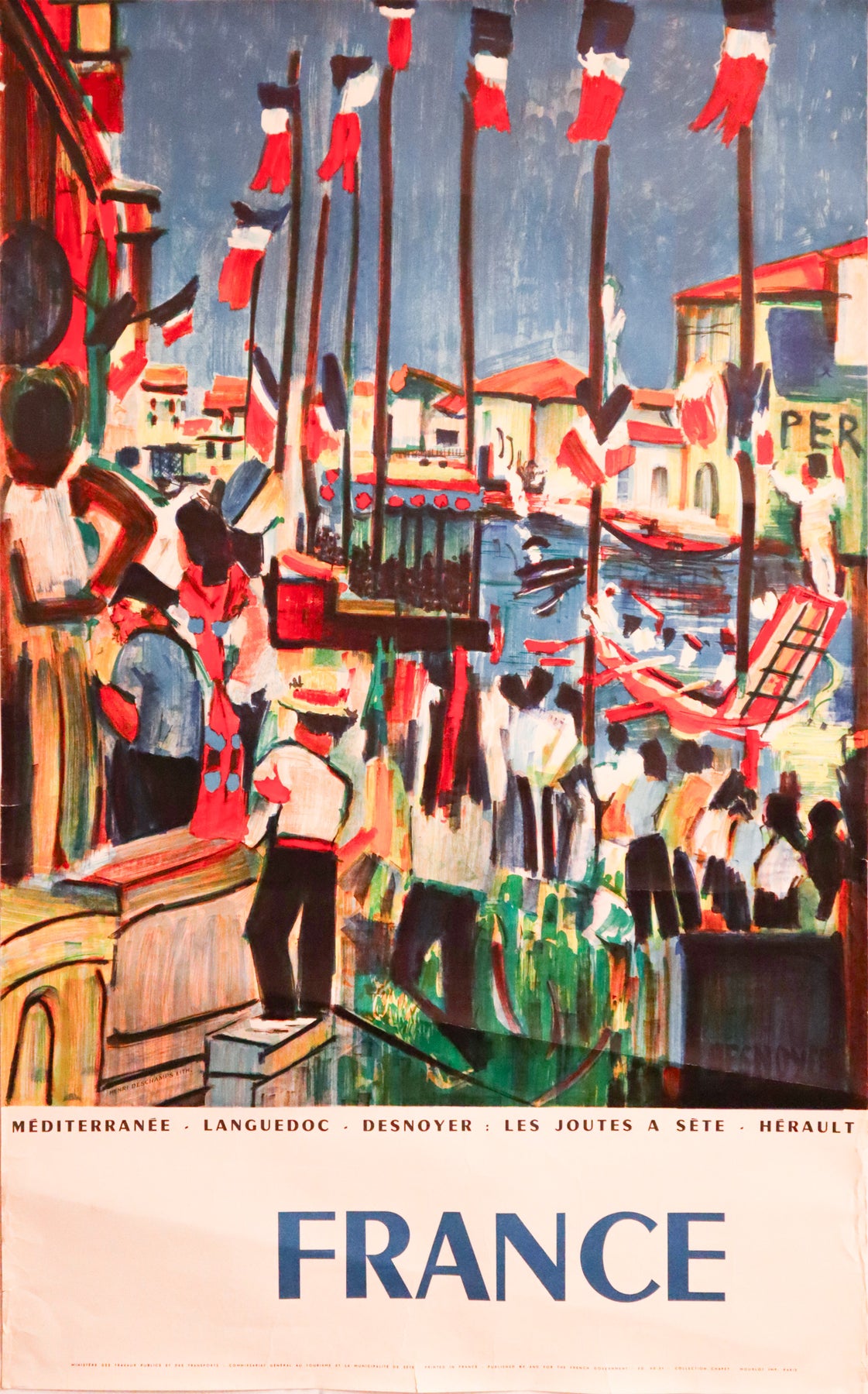 About The Poster: A fabulous travel poster advertising travel to France, and highlighting some of the regions - Languedoc, the Mediterranean and Sete - for which the country is best known.
